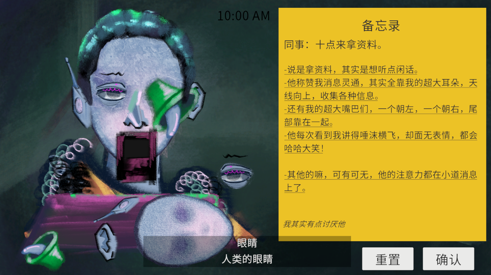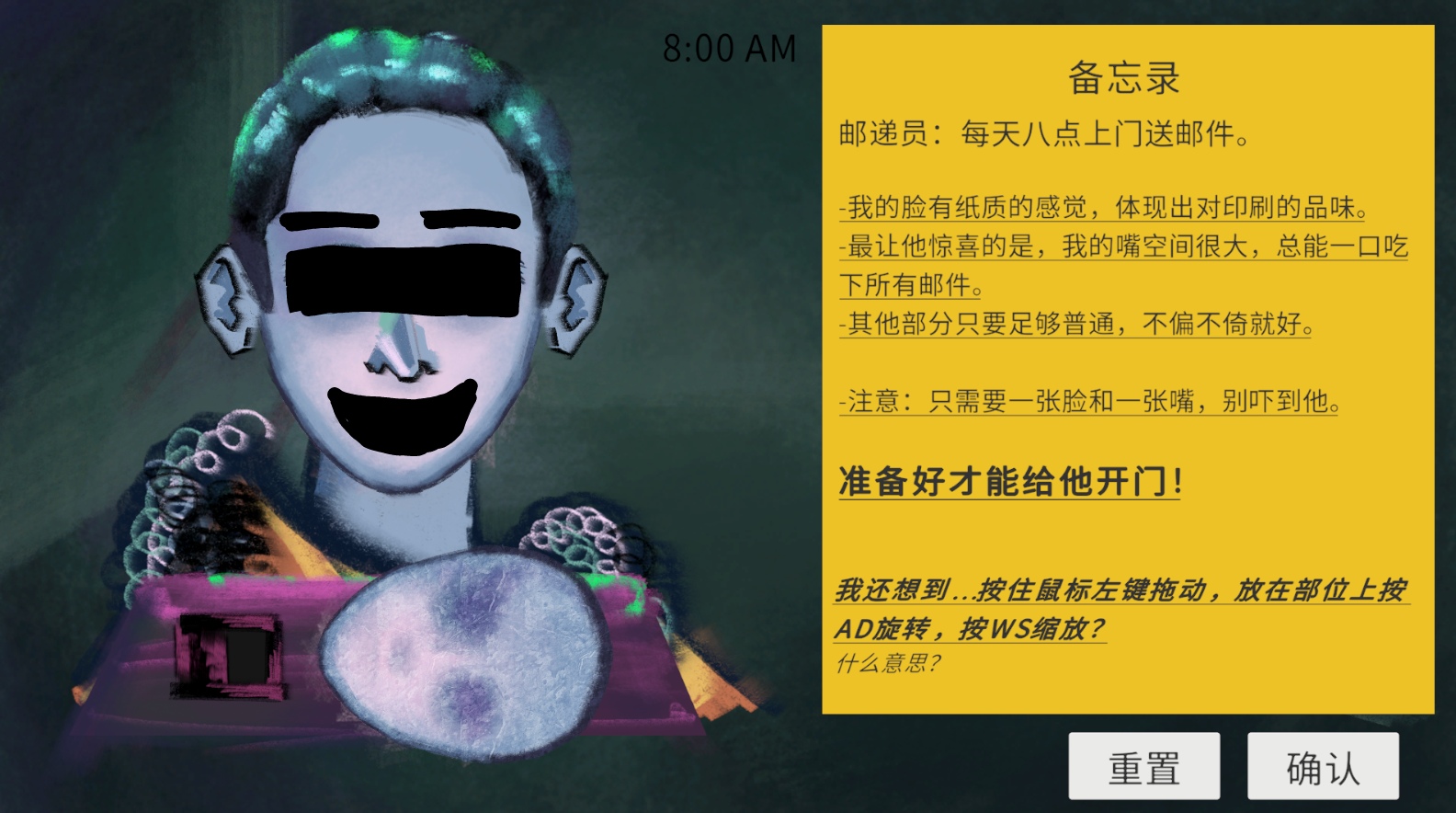 《面面具到》是一款点击解谜类的游戏,玩家作为一名“人类“选择合适的五官,来应对不同的场合,游戏有两个不同的结局。